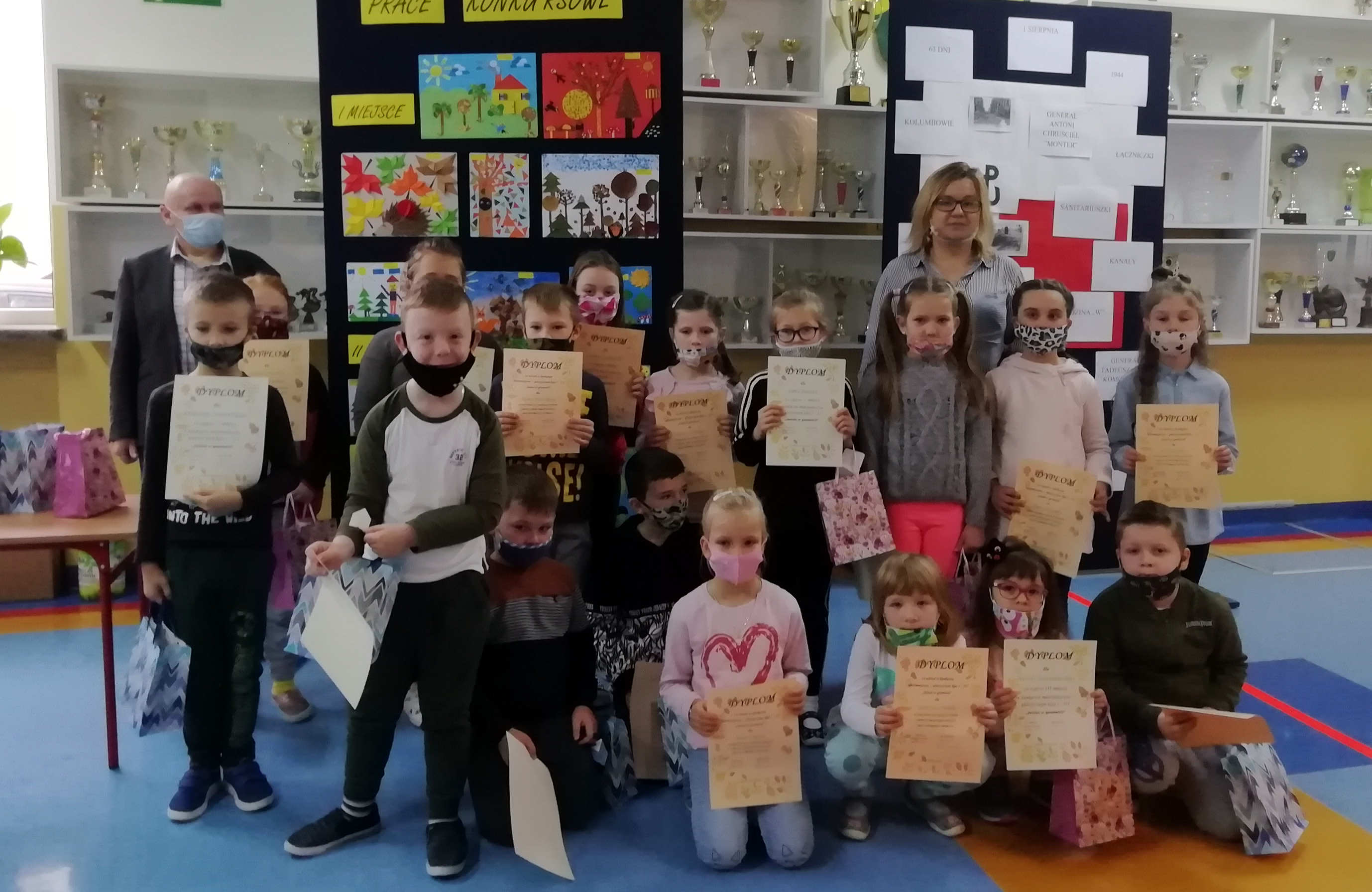 Zwycięzcy konkursu "Jesień w geometrii" odebrali nagrody i dyplomy od dyrektora szkoły.