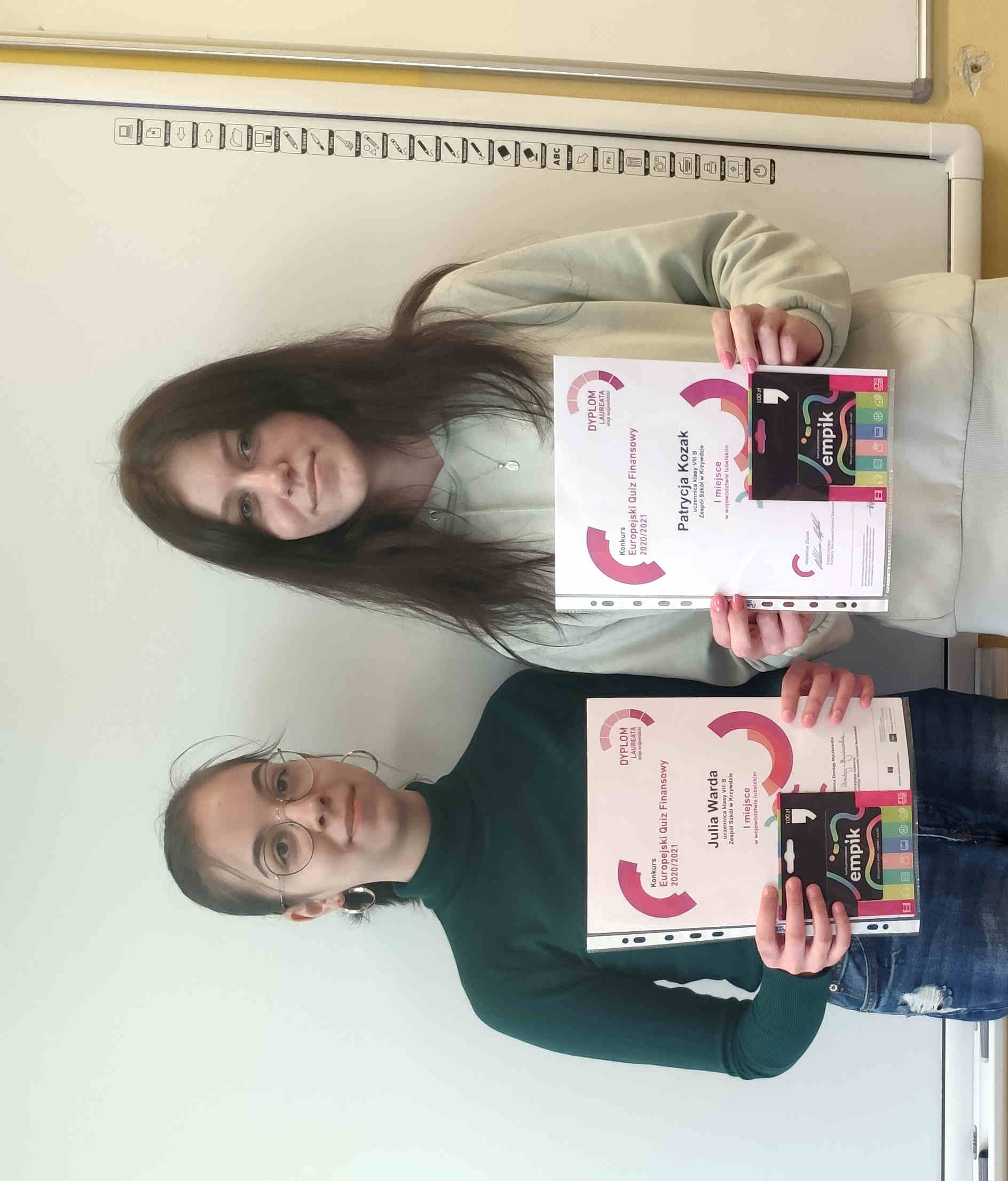 Etap wojewódzki zakończył się dużym sukcesem jednego z naszych zespołów: Julia Warda i Patrycja Kozak z klasy 8b. Uczennice wykazały się bardzo dużą wiedzą z zakresu bankowości, finansów oraz matematyki i zajęły pierwsze miejsce w województwie lubelskim, przechodząc do półfinału na etapie krajowym. Dnia 15.03.2021, razem z 47 innymi zespołami z całej Polski uczestniczyły w eliminacjach za pośrednictwem platformy clickmeeting rozwiązując test z wykorzystaniem aplikacji Kahoot. Niestety miejsce uzyskane w półfinale nie dało możliwości udziału w finale (do finału przechodziło tylko 10 zespołów spośród 47 które wzięły udział w półfinale). Uzyskany wynik w etapie wojewódzkim wiązał się z nagrodami, które właśnie 19.04.2021 dotarły do szkoły. Dziewczyny otrzymały dyplomy oraz nagrody w postaci bonów do Empiku o wartości 100 zł każdy. Jesteśmy bardzo dumni z sukcesu naszych uczennic! Gratulujemy i życzymy dalszych sukcesów!