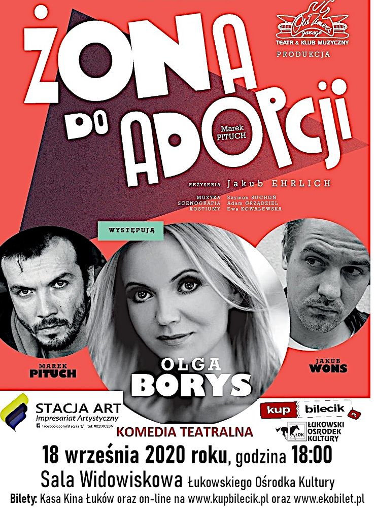 „Żona do adopcji” to znakomita sztuka teatralna w doborowej obsadzie: Olga Borys, Jakub Wons i Marek Pituch. Opowiada ona historię Adama. W jego życiu wszystko miało swoje miejsce – dom praca, dom praca. Od czasu do czasu jakaś kontrolowana rozrywka. Ale w życiu każdego człowieka przychodzi taka chwila, że nawet dobrze naoliwiona maszyna przestaje funkcjonować i niebo zaczyna walić się na głowę. Żona Adama wyjeżdża. Mieszkanie nawiedza natrętny domokrążca i wróżbita. Niespodziewanie pojawia się również Filip, kolega z podstawówki. Do drzwi puka przedstawicielka Ośrodka Adopcyjnego, o której wizycie Adam zupełnie zapomniał. Spokojne dotychczas życie bohatera wypełnia się mnóstwem niedomówień, pomówień i abstrakcyjnych insynuacji. A wszystko przykryte płaszczem „normalności”. Jak rozwiąże się splot dziwnych wydarzeń? Czy prawdziwych przyjaciół rzeczywiście poznaje się w biedzie? Trzeba to zobaczyć!!!