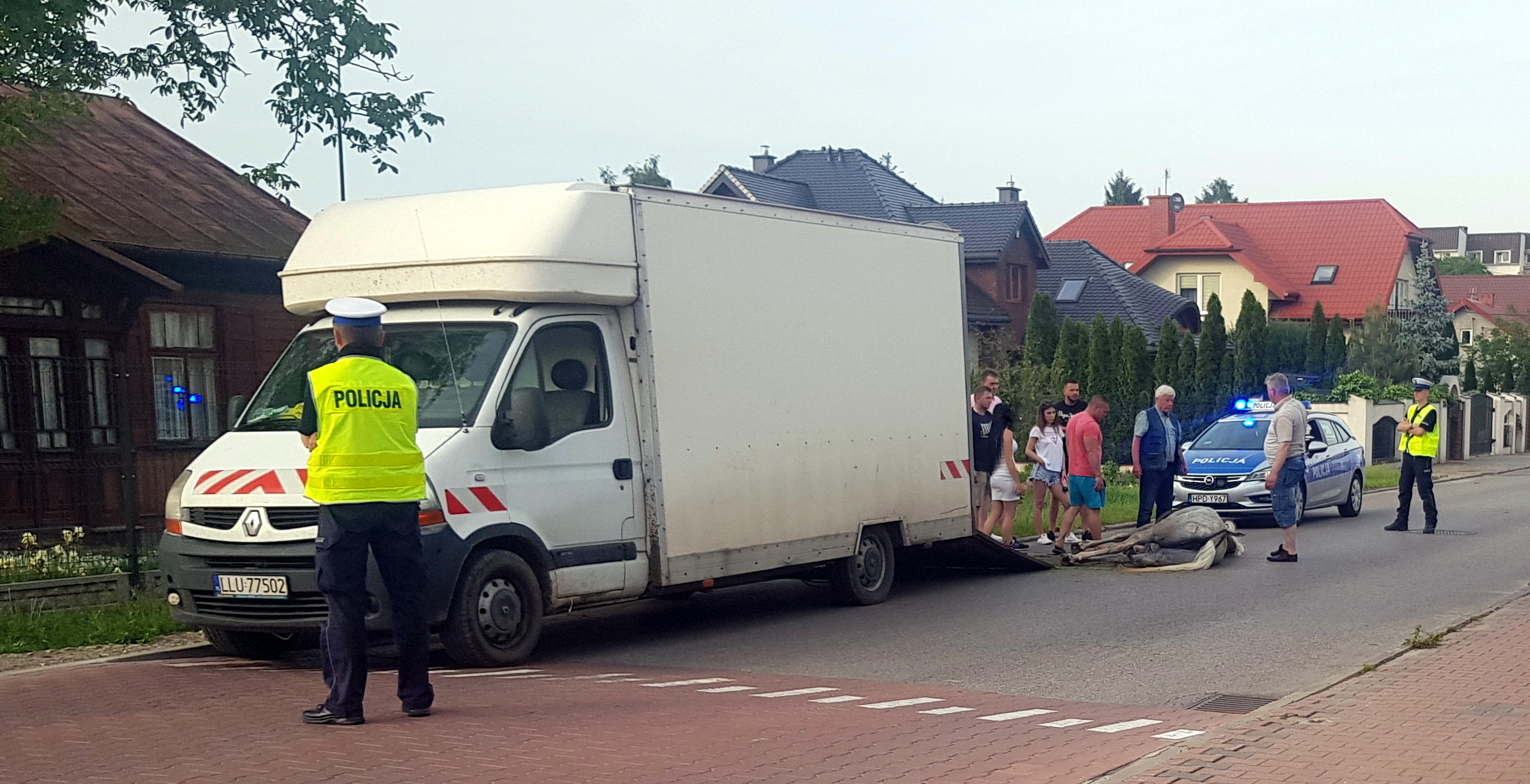 Na miejscu był weterynarz. Osoby zajmujące się koniem i przechodnie pomogli wciągnąć konia na przyczepę. Samochód z koniem odjechał.