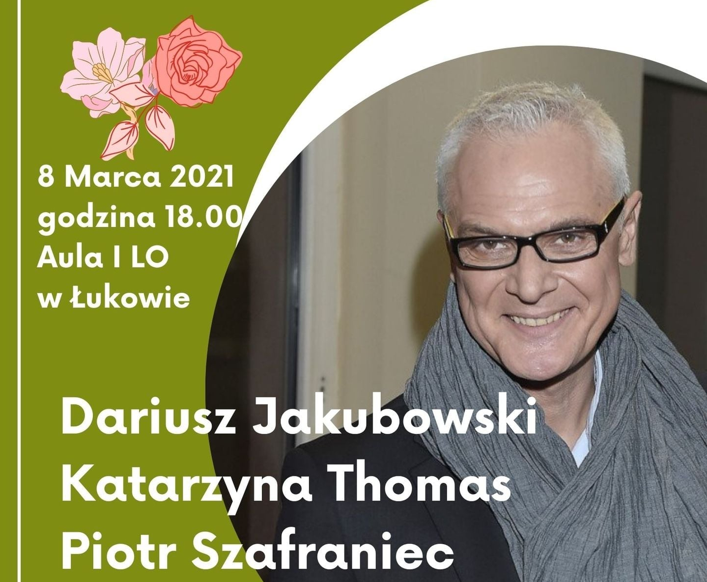 Koncert odbędzie się 8 marca 2021r. o godz. 18.00 w auli I Liceum Ogólnokształcącego im. T. Kościuszki w Łukowie.