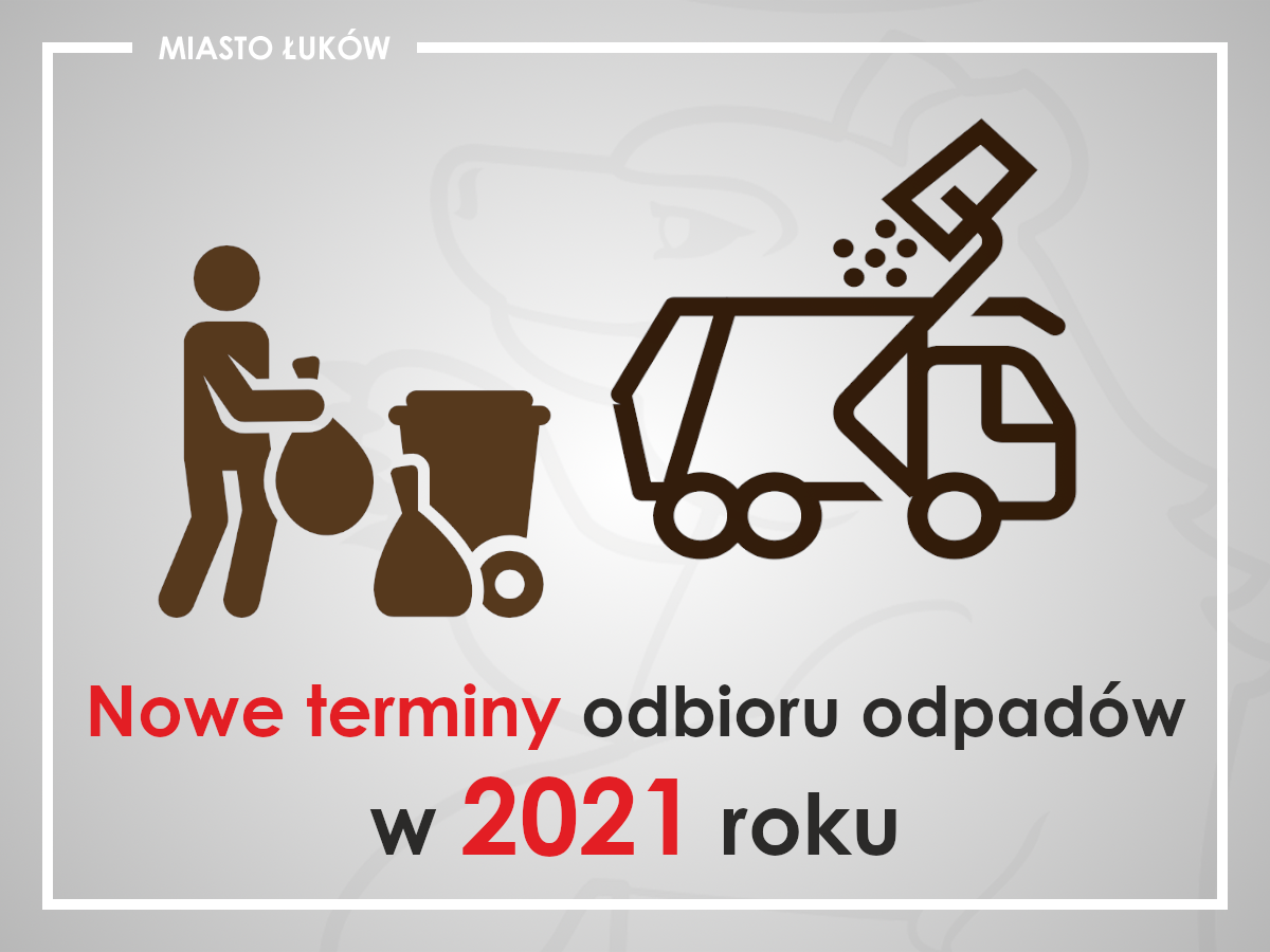 Urząd Miasta Łuków informuje, że od 1 stycznia zmieniają się dni odbiorów odpadów komunalnych dla mieszkańców miasta dla poszczególnych ulic. Miasto zostanie podzielone na 6 rejonów skupiających wybrane ulice, kiedy to będą odbierane śmieci. Odbiór odpadów od przedsiębiorców będzie się odbywał zgodnie z rozkładami dla nieruchomości zamieszkałych.