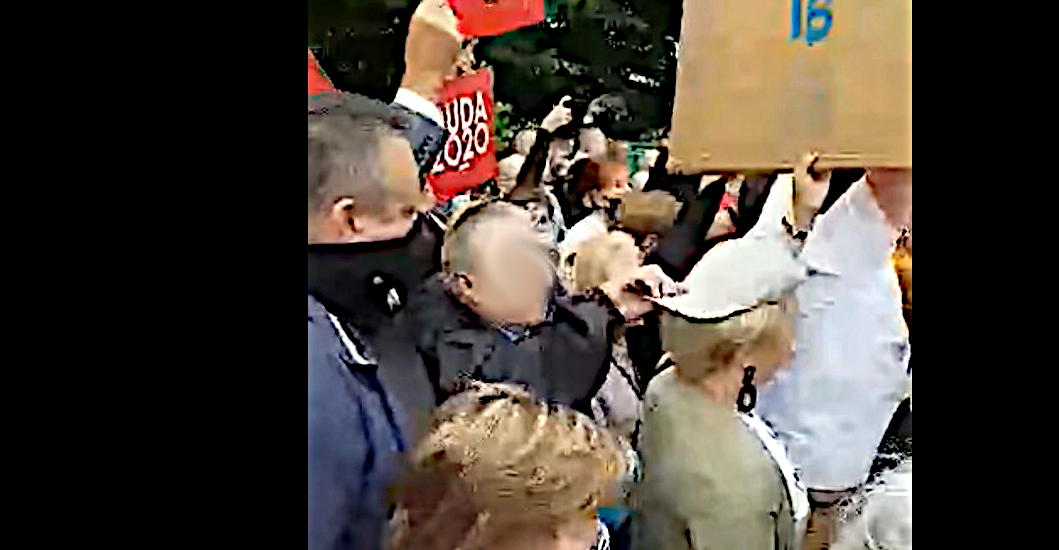W tym momencie zostaje zatrzymany przez policjanta. Nieoficjalnie wiemy, że 59-latek był wcześniej kilka razy upominany przez policjantów jeżeli chodzi o jego zachowanie podczas wiecu.