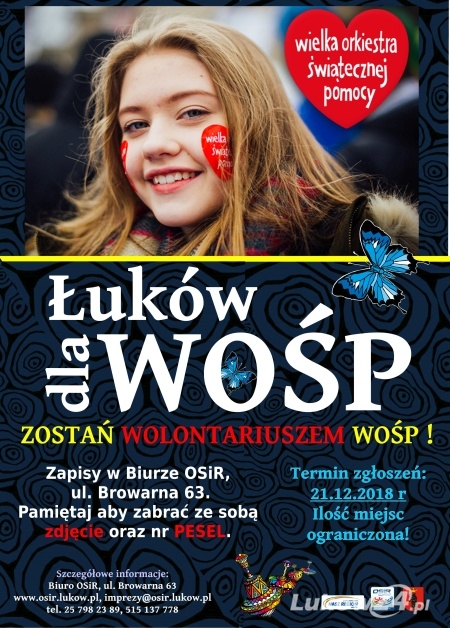 Wiadomości13 stycznia 2019 r. w Łukowie obchodzony będzie 27. Finał Wielkiej Orkiestry Świątecznej Pomocy. Na kilkanaście tygodni przed wydarzeniem działający przy Ośrodku Sportu i Rekreacji sztab WOŚP szuka wolontariuszy pragnących kwestować na zakup sprzętu dla specjalistycznych szpitali dziecięcych.