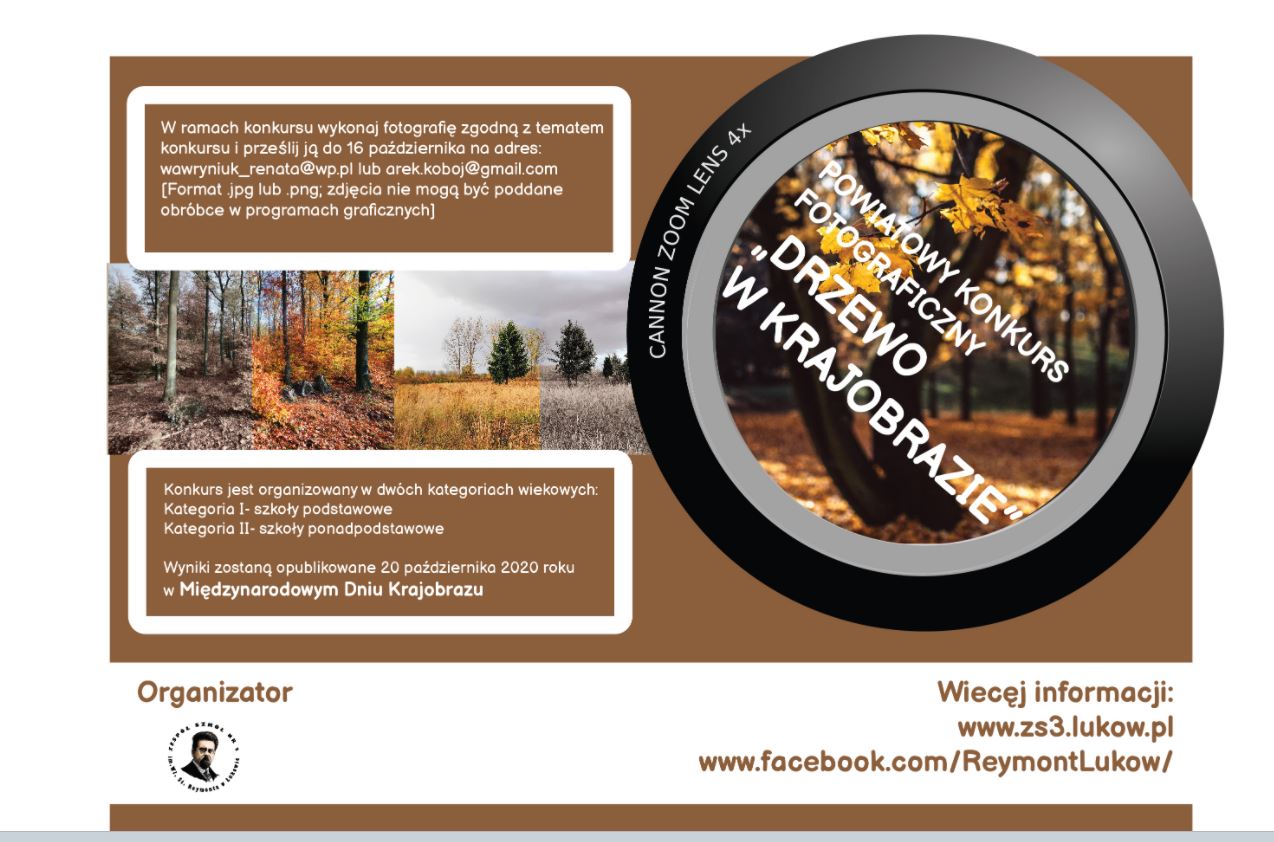 Włączając się w obchody Międzynarodowego Dnia Krajobrazu 2020, których organizatorem jest Generalna Dyrekcja Ochrony Środowiska, Zespół Szkół nr 3 im. Wł. St. Reymonta w Łukowie zachęca do wzięcia udziału w konkursie fotograficznym „Drzewo w krajobrazie”.