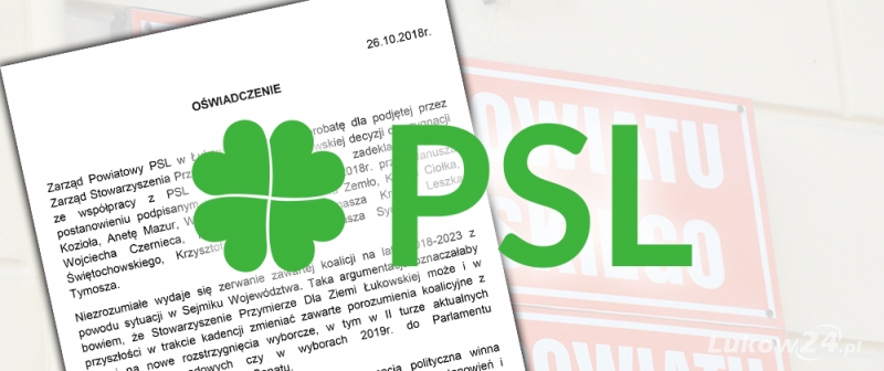 Zarząd Powiatowy PSL w Łukowie wyraża dezaprobatę dla podjętej przez Zarząd Stowarzyszenia Przymierze Dla Ziemi Łukowskiej decyzji o rezygnacji ze współpracy z PSL w Powiecie Łukowskim, zadeklarowanej w postanowieniu podpisanym w dniu 22 października 2018 r. przez Janusza Kozioła, Anetę Mazur, Władysława Mikę, Zbigniewa Zemło, Karola Ciołka, Wojciecha Czernieca, Krzysztofa Fornala, Tomasza Kruka, Leszka Świętochowskiego, Krzysztofa Wolińskiego, Tomasza Sycha, Henryka Tymosza.