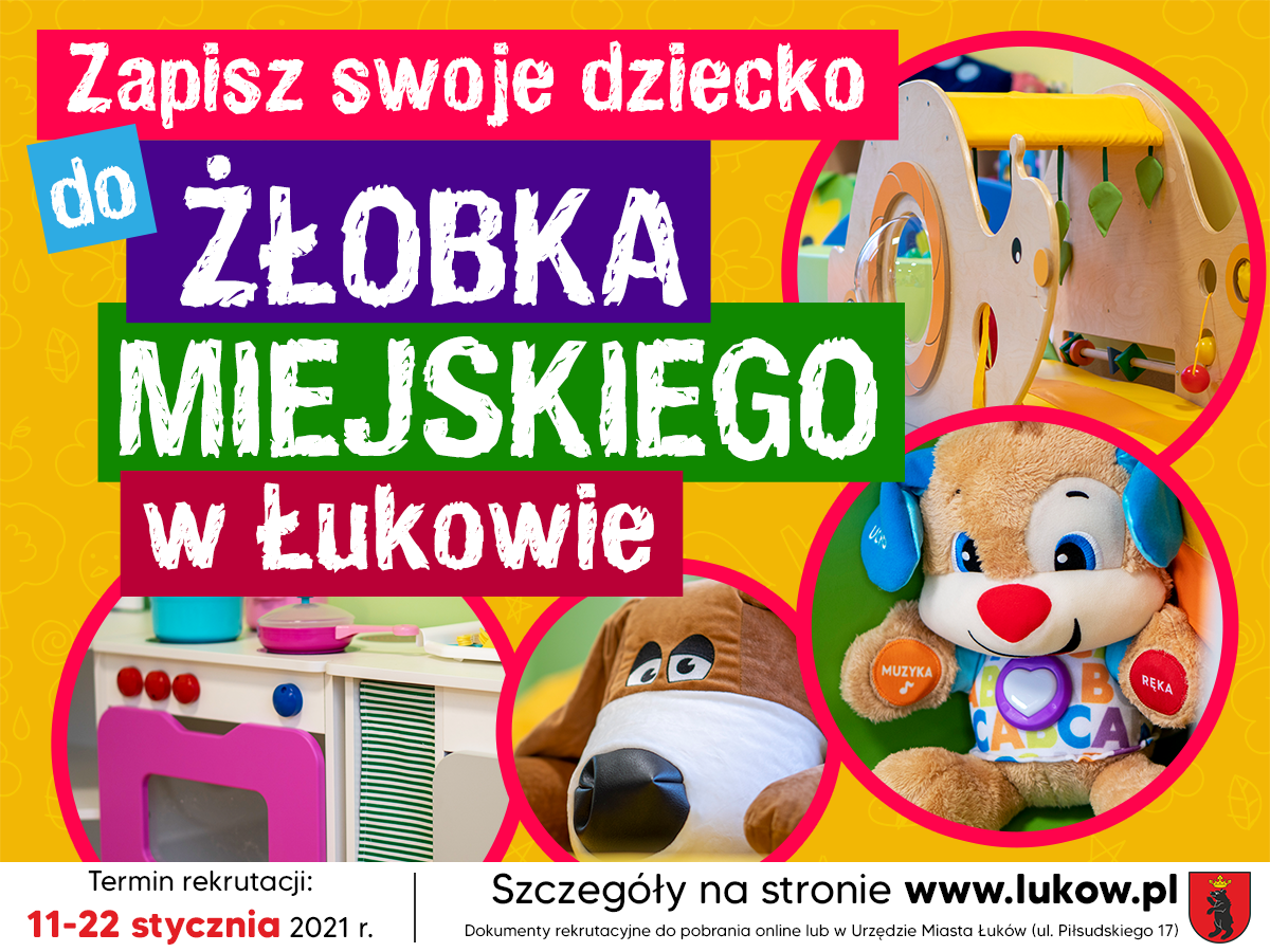 Wypełnioną Kartę zgłoszenia dziecka do Żłobka Miejskiego Nr 1 w Łukowie, w wersji papierowej składać będzie można w pokoju nr 107 (I piętro) Urzędu Miasta (ul. Piłsdudskiego 17), w dniach od 11 do 22 stycznia w godz. od 9:00 do 12:00. Zainteresowane osoby prosimy o szczegółowe zapoznanie się z zapisami w regulaminie oraz karcie zgłoszeniowej!