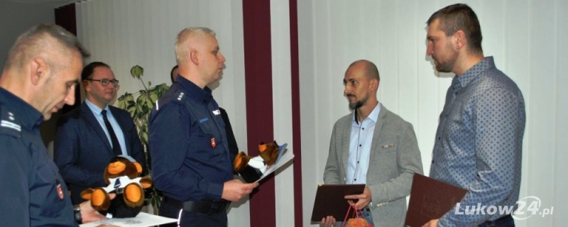 Bohaterska postawa dwóch mężczyzn spotkała się z ogromną aprobatą łukowskich policjantów. Dzisiaj Pan Tomasz i Pan Marcin zostali zaproszeni do gabinetu Komendanta Powiatowego Policji w Łukowie. Mężczyźni otrzymali gorące podziękowania i słowa uznania za godną naśladowania postawę. Nadkom. Leszek Misiak podziękował za wzorową, obywatelską postawę, którą Panowie wykazali się gdy zareagowali widząc mężczyznę bijącego i próbującego okraść pokrzywdzoną kobietę. Dziękując za natychmiastową reakcję, zaangażowanie i pewność siebie nadkom. Misiak zaznaczył, że tak postawa powinna być przykładem i wskazówką dla innych osób, świadków naruszenia prawa. Nadkom. Leszek Misiak mówił, że swoim działaniem Panowie pokazali, że należy przełamywać stereotypy wobec biernych zachowań, że można skutecznie przyczyniać się do ujęcia sprawców przestępstw i wykroczeń.Do życzeń i gratulacji dla Pana Tomasza i Pana Marcina przyłączył się burmistrz Piotr Płudowski, który mówił, że taka postawa z całą pewnością zasługuje na pochwałę i wyróżnienie. Burmistrz zaznaczył, że jest dumny, że w naszym mieście są ludzie, którzy nie boją się zareagować na krzywdę wyrządzaną innym.