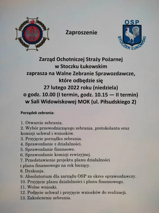 Wiadomości STOCZEK ŁUKOWSKI Zarząd OSP w Stoczku Łukowskim zaprasza na Walne Zebranie Sprawozdawcze, które odbędzie się 27 lutego (niedziela) o godz. 10.00 - pierwszy termin, godz. 10.15 - drugi termin w Sali Widowiskowej MOK (ul. Piłsudskiego 2).