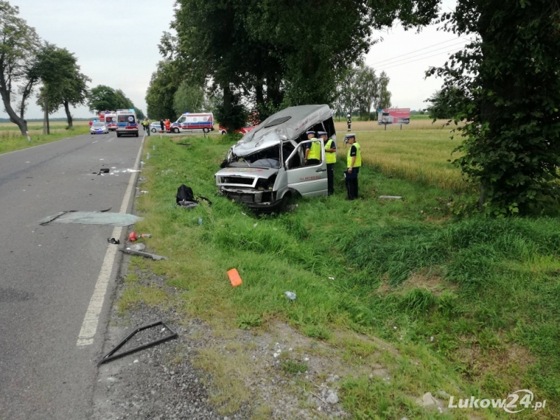 Przed godziną 12.00 dyżurny łukowskiej policji został powiadomiony o zdarzeniu drogowym, w którym rannych zostało 14 osób. Jak powiedział nam rzecznik prasowy policji Marcin Józwik, ze wstępnych ustaleń policjantów pracujących na miejscu wynika, że obydwa pojazdy poruszały się z Łukowa w kierunku Radzynia Podlaskiego. W toku postępowania będą wyjaśnione przyczyny wypadku. Wiadomo, że samochodem osobowym podróżowała tylko jedna osoba. Wszystkim uczestnikom wypadku została udzielona pierwsza pomoc i decyzją lekarza zostali przewiezieni do szpitala w Łukowie i Radzyniu Podlaskim.