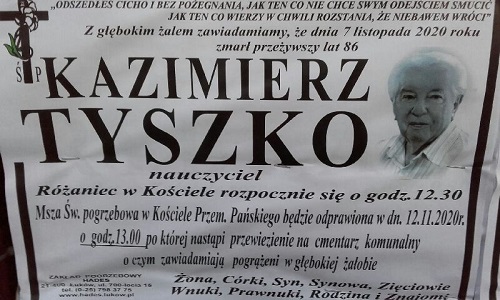 7 listopada 2020r. zmarł Pan Kazimierz Tyszko - Dyrektor Szkoły Podstawowej nr 4 w Łukowie w latach 1985-1991.