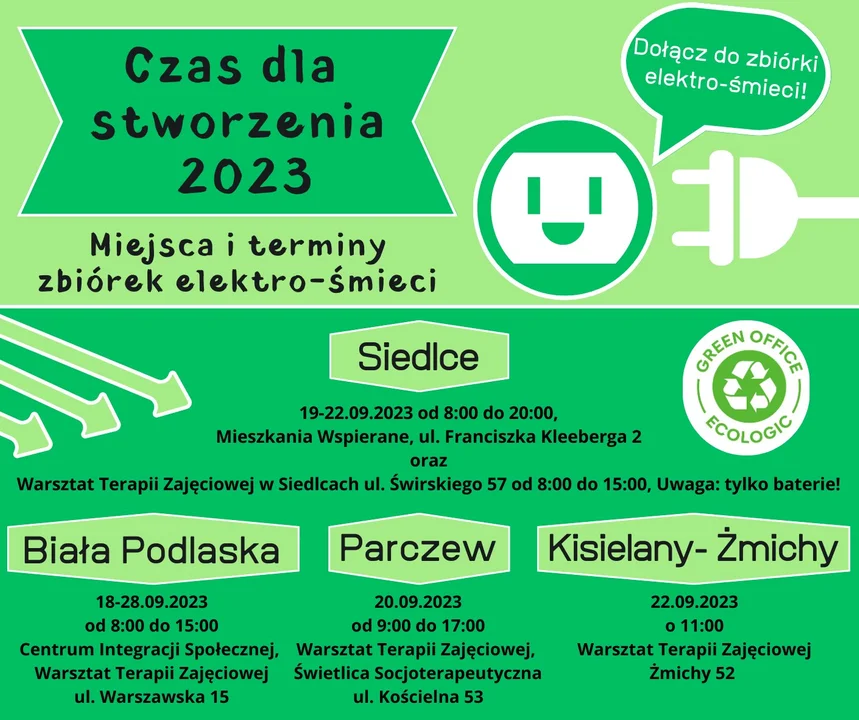 - Siedlce: 19-22.09.2023 r. w godzinach od 8:00 do 15:00, Warsztat Terapii Zajęciowej w Siedlcach ul. Świrskiego 57 (Uwaga: tylko baterie!)