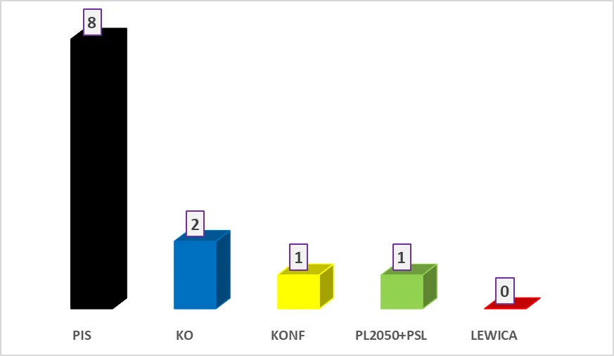 Według prognoz Twitterowicza Marcina Palade PiS zgarnie 8 mandatów, KO - 2, Trzecia Droga - 1 oraz Konfederacja - 1.