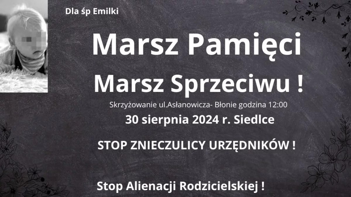 - 30 sierpnia ubrani na czarno spotkamy się na skrzyżowaniu ul. Mieczysława Asłanowicza i Błonie przy Urzędzie Gminy o 12:00 i po godzinnym PROTEŚCIE OJCÓW udamy się spokojnie na Marsz Pamięci do miejsca, gdzie doszło do tej tragedii tj. ul. Kardynała Wyszyńskiego 11. – Tam nastąpi koniec Marszu - czytamy na fanpage'u wydarzenia.
