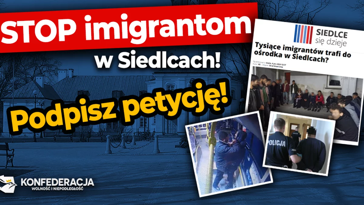 Siedlce w ostatnich latach stały się miejscem, w którym mieszkańcy nie mogą czuć się bezpiecznie, czego przykładem był napad z nożem w ręku na 15-latka, Polaka, w autobusie miejskim, jakiego dokonał obywatel Ukrainy. Imigranci regularnie zakłócają porządek w naszym mieście, zaczepiając mieszkańców w centrum czy organizując libacje alkoholowe nad zalewem. Spraw tego typu jest o wiele więcej. Warto wskazać także na problem nielegalnych imigrantów, którzy coraz częściej pojawiają się w naszym mieście i jego okolicach. W czerwcu ubiegłego roku w centrum Siedlec zatrzymano kilkunastu nielegalnych imigrantów. Dokonano także obywatelskiego zatrzymania samochodu przewożącego imigrantów w pobliżu naszego miasta. Siedlce, jak i cała Polska, zmagają się już niestety z efektami masowej i niekontrolowanej imigracji, której skutki społeczne i ekonomiczne zaczynamy ponosić my wszyscy. Nie godzimy się z tą szaleńczą polityką i powielaniem błędów „zachodu”!