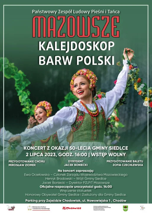 Następnie po krótkim przypomnieniu historii gminy i tego jak się zmieniła na przełomie pół wieku będziemy mieli okazję podziwiać występ znanego w całej Polsce i na świecie Państwowego Zespołu Ludowego Pieśni i Tańca Mazowsze. Az 160 osób stanie na scenie w Chodowie i zaprezentuje przygotowany występ pod nazwą Kalejdoskop Barw Polski.