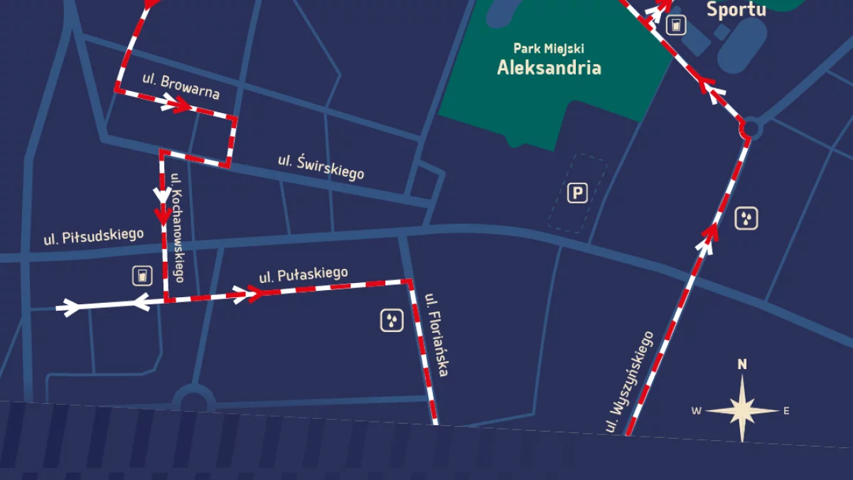 Trasa biegu na 5 km: Prusa – Czerwonego Krzyża – Rynkowa – 11 listopada – Browarna – Czerwonego Krzyża – Bpa Świrskiego – Kochanowskiego – Pułaskiego – Floriańska – Brzeska – 3 Maja – Wyszyńskiego – Kazimierzowska – Prusa.