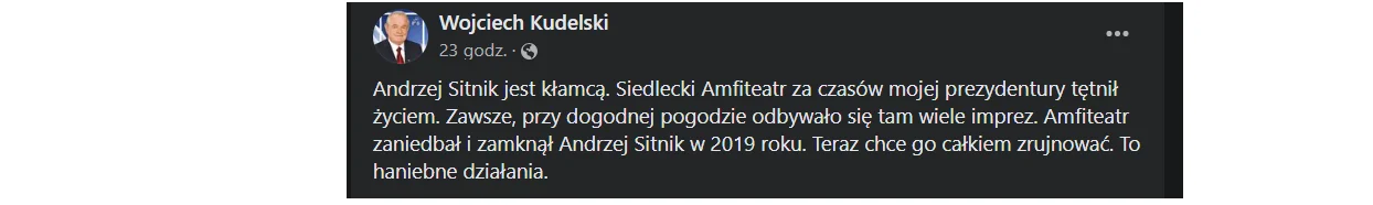 Andrzej Sitnik jest kłamcą. Siedlecki Amfiteatr za czasów mojej prezydentury tętnił życiem. Zawsze, przy dogodnej pogodzie odbywało się tam wiele imprez. Amfiteatr zaniedbał i zamknął Andrzej Sitnik w 2019 roku. Teraz chce go całkiem zrujnować. To haniebne działania.
