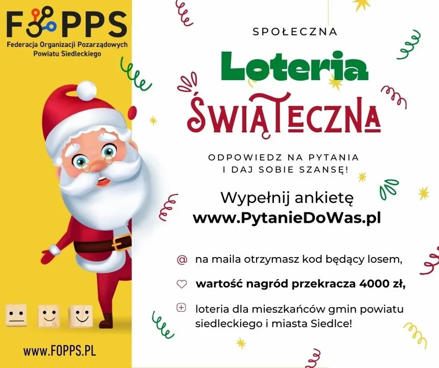 Ankieta www.PytanieDoWas.pl jest anonimowa, a jej wyniki posłużą do stworzenia Regionalnego Planu Działania dostosowanego do potrzeb mieszkańców i całego regionu. Dodatkowo po jej wypełnieniu do dnia 20.12.2023 osobom, które pozostawią maila przesłany zostanie kod, który weźmie udział w losowaniu wartościowych nagród opisanych na stronie www.fopps.pl/loteria