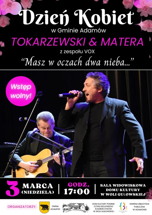 Z okazji Dnia Kobiet w sali widowiskowej Domu Kultury w Woli Gułowskiej odbędzie się koncert w Domu Kultury w Woli Gułowskiej. Gwiazda :Tokarzewski i Matera z zespołu VOX. Do zobaczenia 3 marca godz. 17:00.