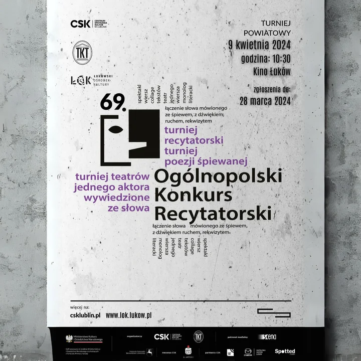 Regulamin oraz karta zgłoszeniowa do pobrania są na stronie: www.lok.lukow.pl/artykul/4536,eliminacje-powiatowe-69-ogolnopolski-konkurs-recytatorski-zgloszenia-do-28-03-24