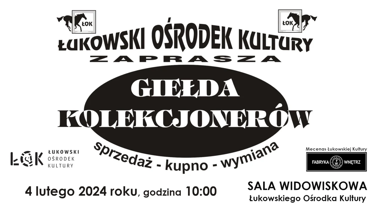 Zapowiedzi imprezŁukowski Ośrodek Kultury zaprasza na kolejną Giełdę Kolekcjonerów. Wydarzenie odbędzie się w niedzielę 4 lutego od godziny 10:00 w sali widowiskowej ŁOK.