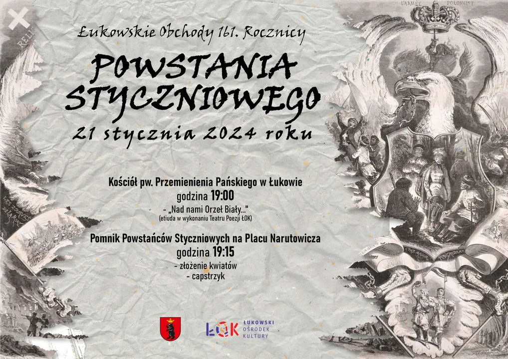 Przypominamy, że Powstanie Styczniowe było największe polskim powstaniem narodowym. Było skierowane przeciwko Imperium Rosyjskiemu. Zostało ogłoszone Manifestem 22 stycznia 1863 roku, wydanym w Warszawie przez Tymczasowy Rząd Narodowy. Wybuchło 22 stycznia 1863 roku w Królestwie Polskim i 1 lutego 1863 roku na Litwie. Trwało do jesieni 1864 roku. Miało ono charakter wojny partyzanckiej, w której stoczono ok. 1200 bitew i potyczek. Przez oddziały powstania styczniowego przewinęło się około 200 tys. ludzi. Mimo początkowych sukcesów zakończyło się klęską powstańców, z których kilkadziesiąt tysięcy zostało zabitych w walkach, blisko 1 tys. straconych, ok. 38 tys. skazanych na katorgę lub zesłanych na Syberię, a ok. 10 tys. wyemigrowało. Zdarzały się przypadki, że Rosjanie zabijali pojmanych powstańców, dobijali rannych, mordowali lekarzy spieszących im z pomocą, obdzierali do naga zabitych. Po bitwach Rosjanie palili miejscowości, które udzieliły schronienia powstańcom, dokonywali rzezi ludności cywilnej. Niszczono dobra kultury. Przypominamy, że wielu młodych łukowian zaciągnęło się do oddziałów powstańczych, które na początku toczyły z zaborcą rosyjskim duże bitwy, rzucając do walk setki, a nawet tysiące ludzi.