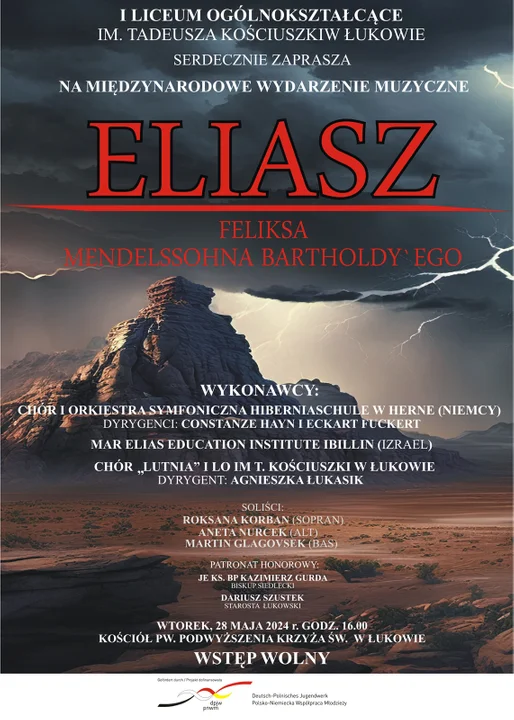 Goście z zagranicy wystąpią razem z chórem „Lutnia”, który działa przy I LO. Koncert pt. „Eliasz” Feliksa Mendelssohna Bartholdy’ego odbędzie się we wtorek 28 maja o godz. 16:00 w kościele pw. Podwyższenia Krzyża Świętego w Łukowie. Oprócz wspomnianych wykonawców, wystąpią na nim także soliści: Roksana Korban (sopran), Aneta Nurcek (alt) i Martin Glagovsek (bas).