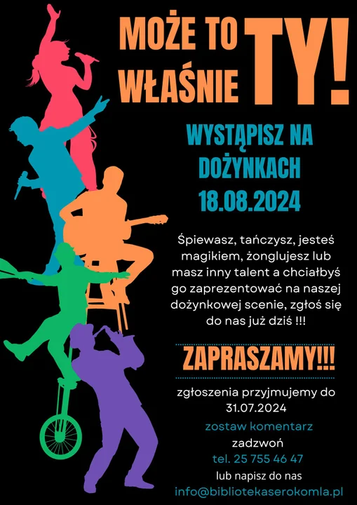 Organizatorzy Dożynek, które odbędą się 18 sierpnia 2024 roku, poszukują utalentowanych osób, które pragną podzielić się swoją pasją i umiejętnościami z mieszkańcami naszej gminy. Jeśli śpiewasz, tańczysz, jesteś magikiem, żonglujesz lub posiadasz inny niepowtarzalny talent, nie czekaj dłużej - zgłoś się już dziś!