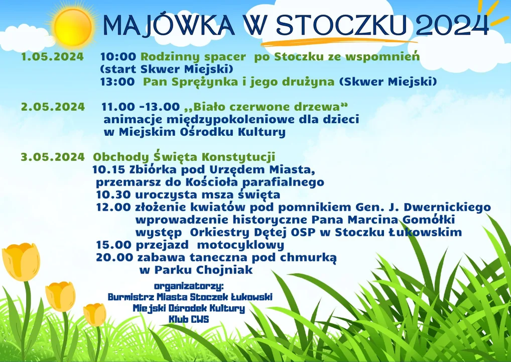 W środę 1 maja: o godz. 10:00 zaplanowano Rodzinny spacer po Stoczku ze wspomnień (start Skwer Miejski), a o godz. 13:00 Pan Sprężynka i jego drużyna (Skwer Miejski)