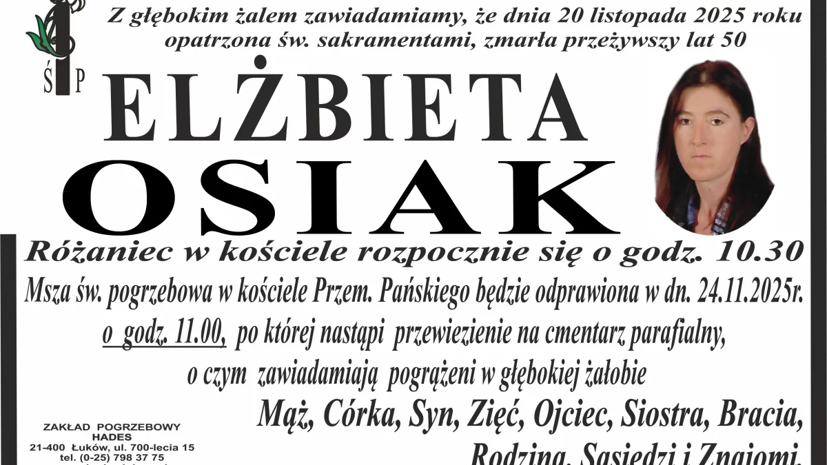 ZMARLIZ głębokim żalem zawiadamiamy, że 20 listopada zmarła przeżywszy 50 lat Elżbieta Osiak.